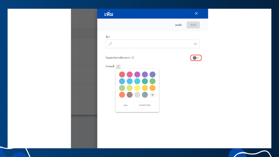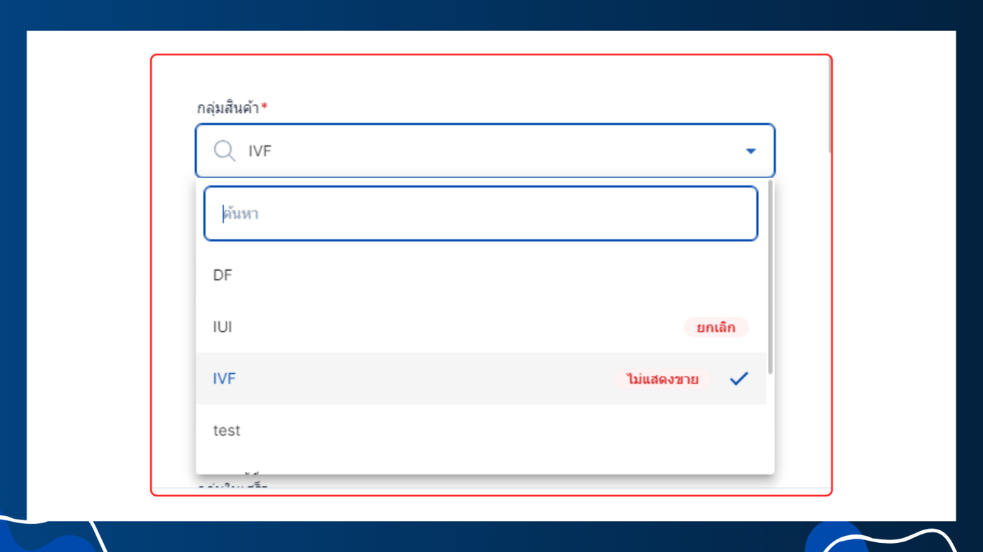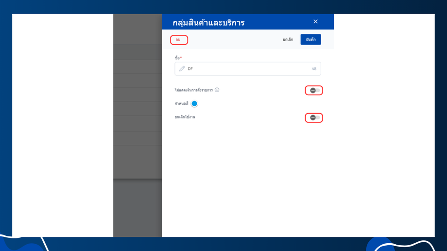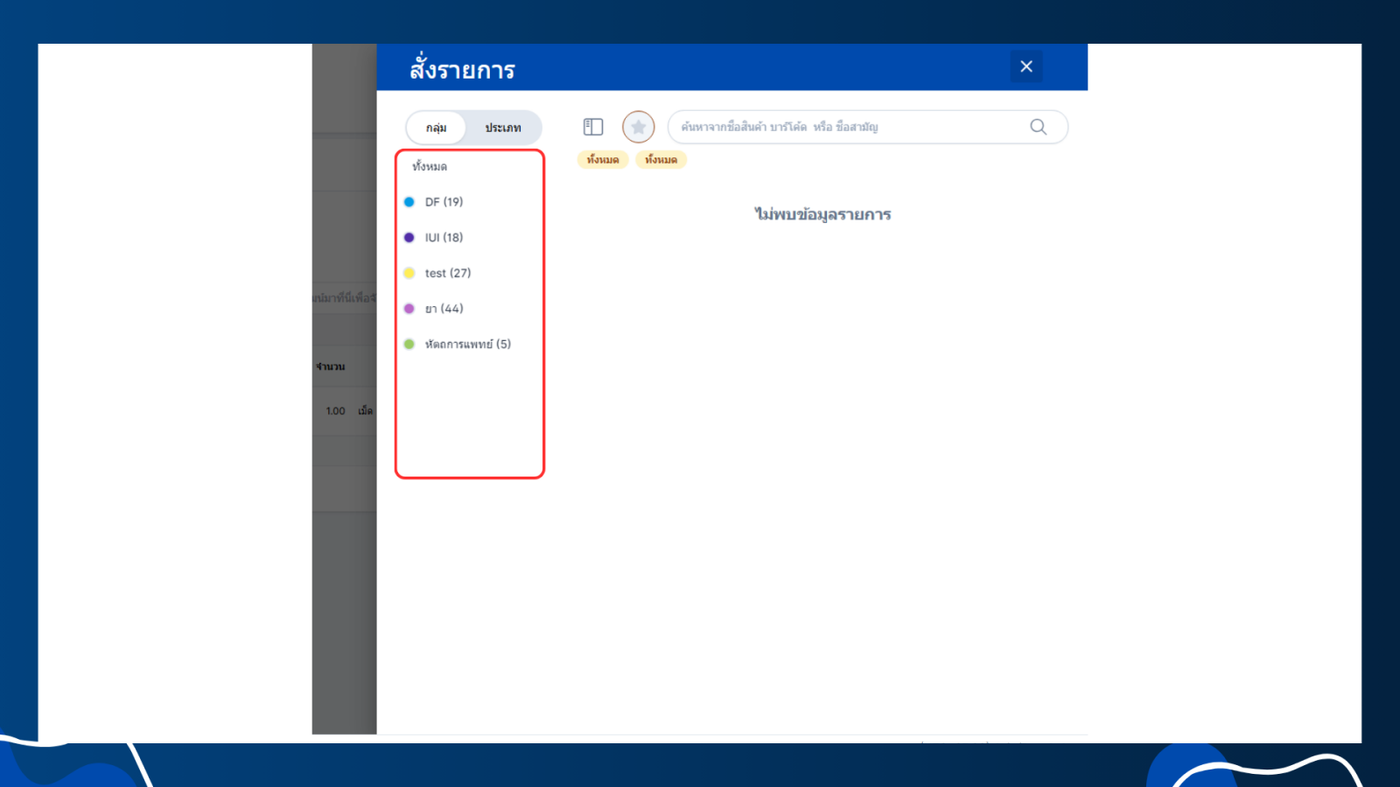 - ไม่แสดงในการสั่งรายการ คือรายการสินค้าที่อยู่ในกลุ่มนี้จะไม่แสดงในหน้าสั่งรายการ