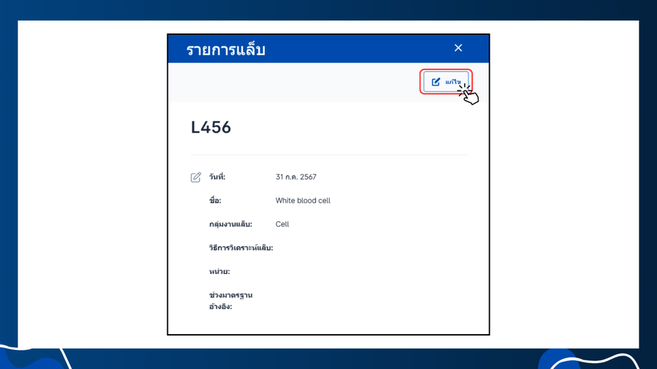 - แก้ไขข้อมูลต่างๆ เช่น รหัส, ชื่อ, กลุ่มงานแล็บ