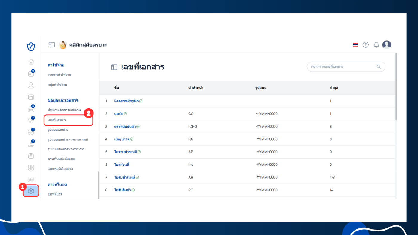 เลขที่เอกสารที่สามารถทำการรีเซ็ตได้ ได้แก่ รายการแล็บ ใบเสร็จรับเงิน และรหัสลูกค้า สามารถรีเซ็ตเลขที่เอกสารได้โดยการกดเปิดด้านขวา และเลือกประเภทการรีเซ็ต ว่าต้องการให้รีเซ็ตทุกวัน ทุกเดือน หรือทุกปี