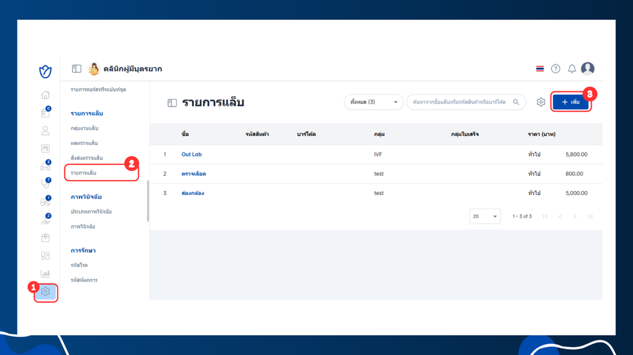 การตั้งค่ารายการแล็บ คือบันทึกข้อมูลรายการแล็บโดยมี ข้อมูลทั่วไป ข้อมูลราคา ข้อมูลคำสั่งแล็บ ข้อมูลผลแล็บ และค่าตอบแทน เมื่อเพิ่มรายการแล้วการใช้งานจะอยู่ในส่วนของการสั่งรายการแล็บในห้องตรวจ