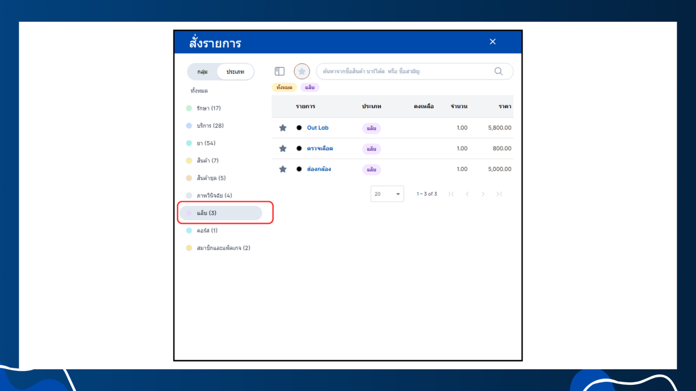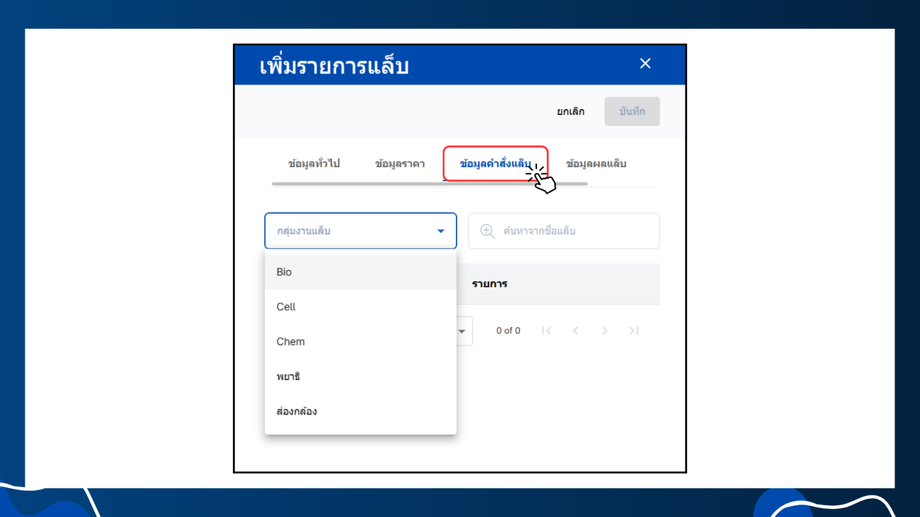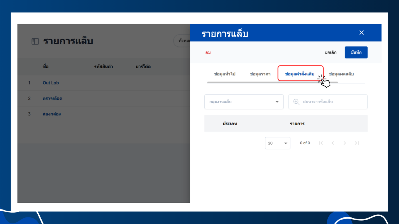 ข้อมูลคำสั่งแล็บ: เลือกประเภทแล็บและค้นหาชื่อแล็บที่ต้องการ