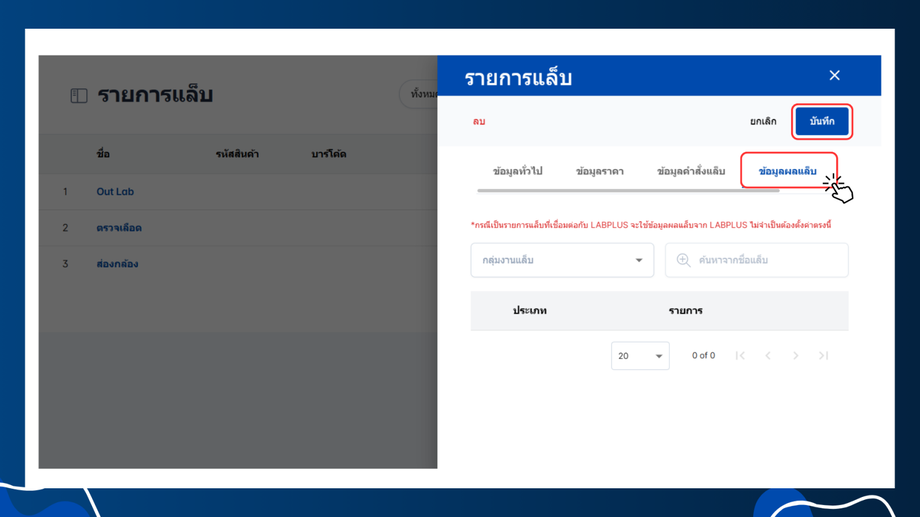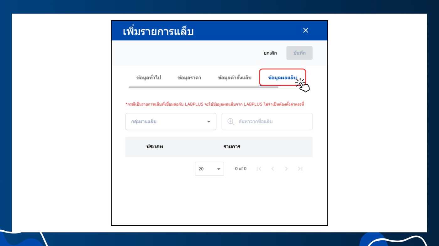 ข้อมูลผลแล็บ: เลือกประเภทแล็บและค้นหาชื่อผลแล็บที่ต้องการ