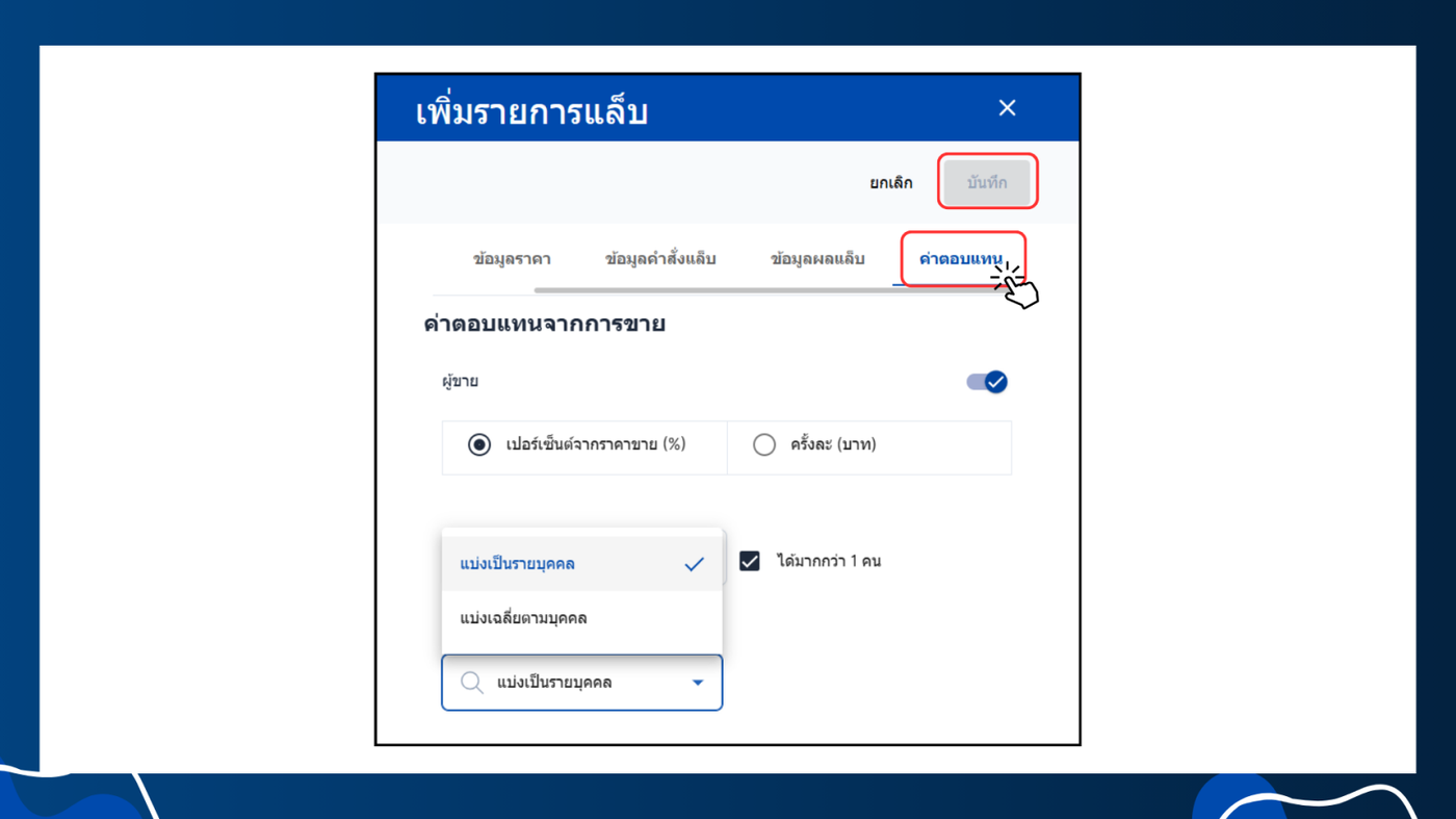 ค่าตอบแทน: สามารถเปิด/ปิดการให้ค่าตอบแทน และระบุผู้รับค่าตอบแทน (สามารถกำหนดได้มากกว่า 1 คน)
