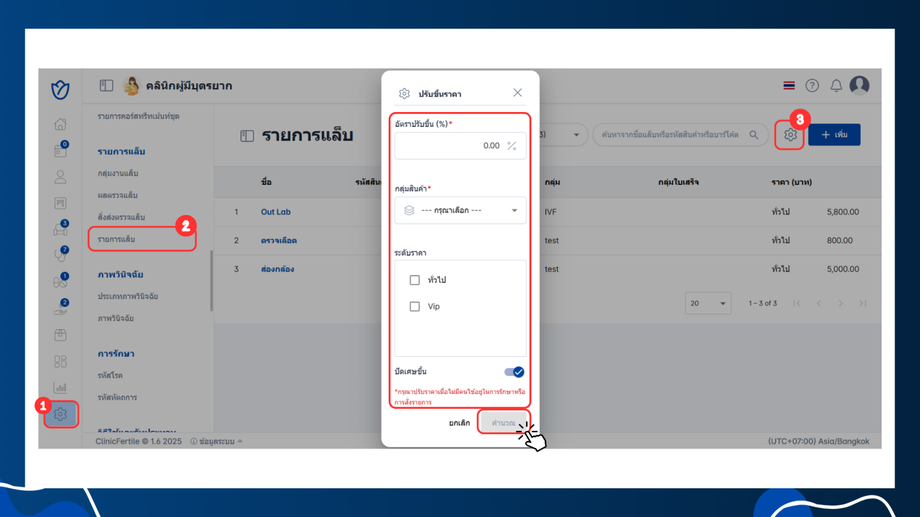 สามารถปรับราคารายการแล็บได้ทั้งหมดโดยเป็นอัตราปรับขึ้นแบบ %