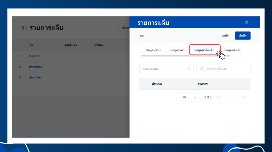 - ข้อมูลทั่วไป: ระบุข้อมูลพื้นฐานเกี่ยวกับรายการแล็บ