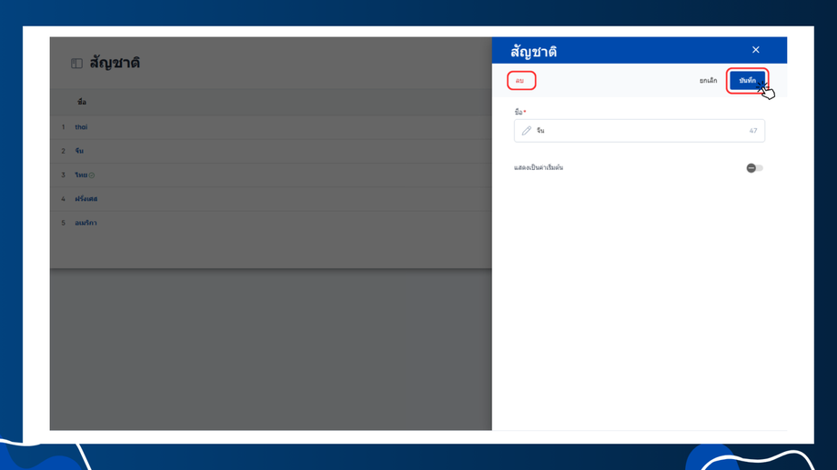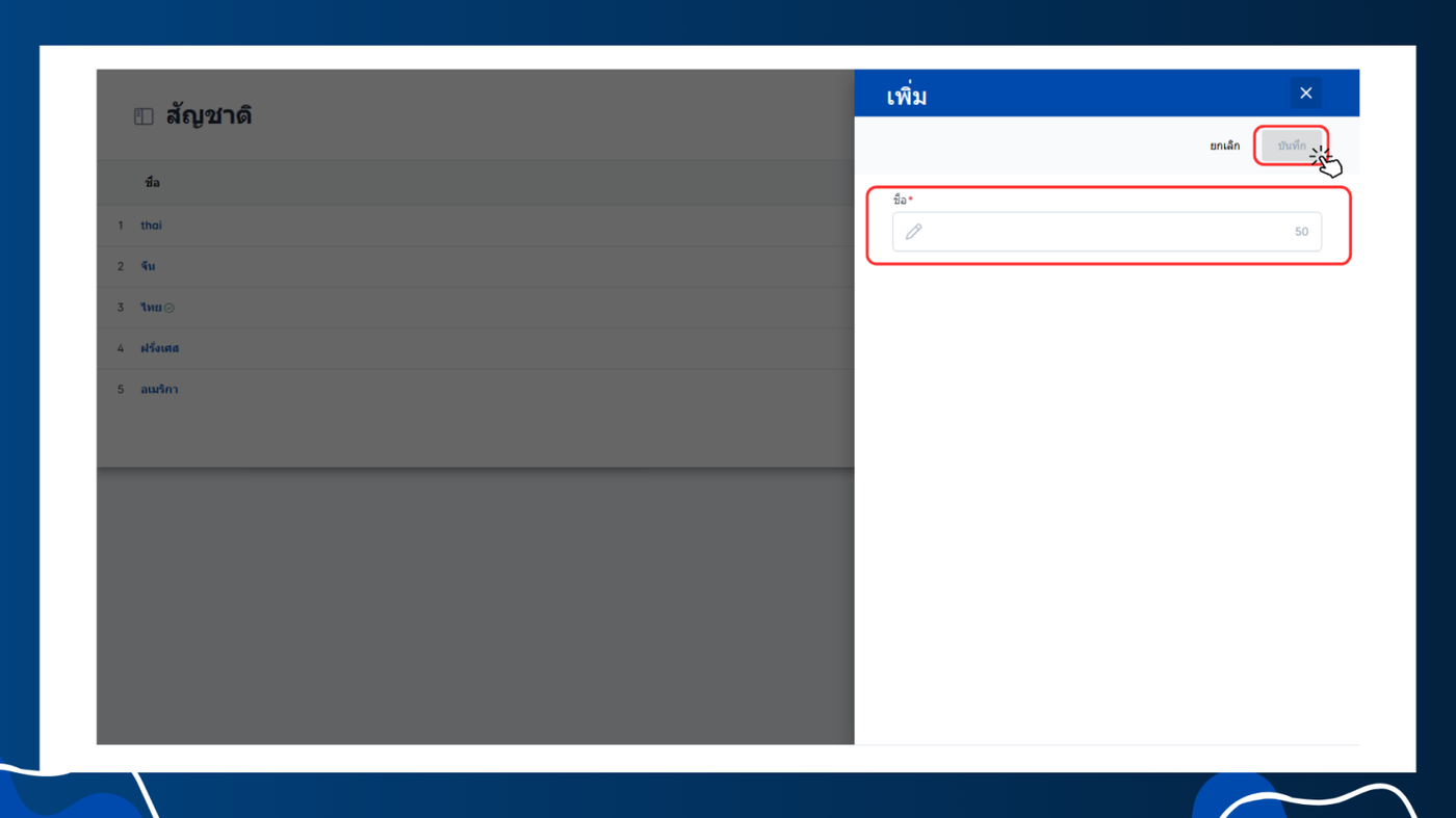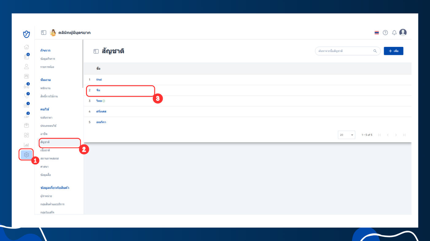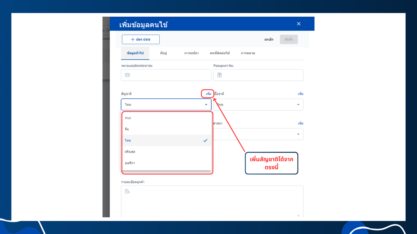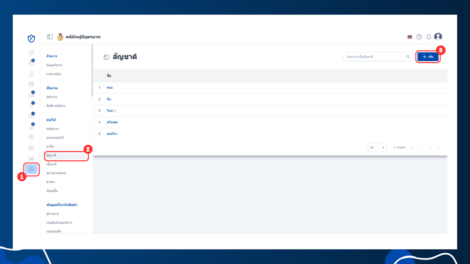 การตั้งค่าข้อมูลสัญชาติจะช่วยให้ผู้ใช้งานสามารถบันทึกข้อมูลสัญชาติของคนไข้ ซึ่งจะปรากฏในขั้นตอนการเพิ่มและแก้ไขข้อมูลคนไข้ เพื่อใช้ในการเก็บข้อมูลทางการตลาด