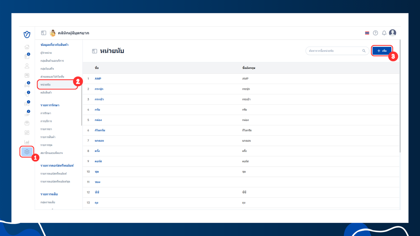 การตั้งค่าหน่วยนับช่วยให้ระบบสามารถแสดงตัวเลือกหน่วยนับในการจัดการสินค้าและบริการต่างๆ เช่น มิลลิลิตร (ml),หรือ หน่วยอื่นๆ ที่เกี่ยวข้อง