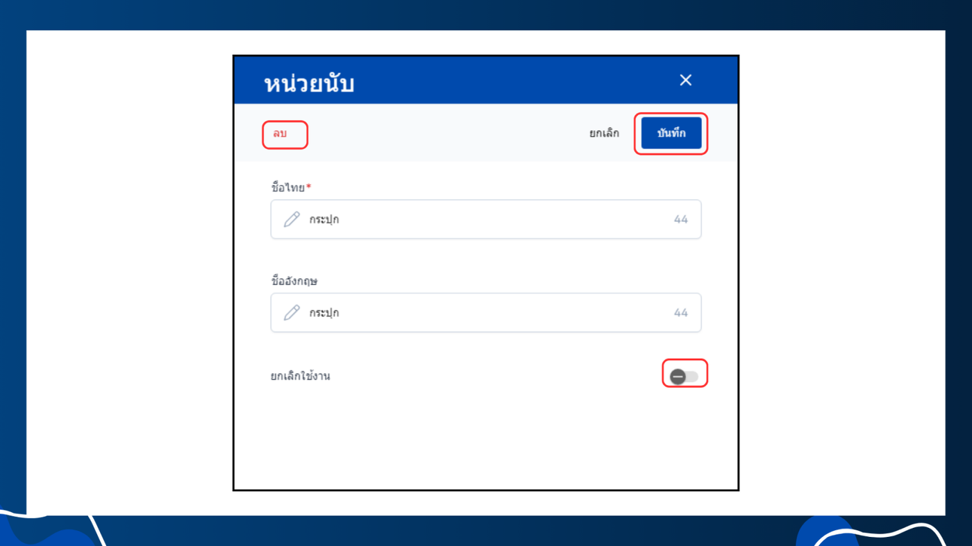 - การลบ: จะลบรายการหน่วยนับออกจากระบบ ไม่สามารถเรียกคืนได้