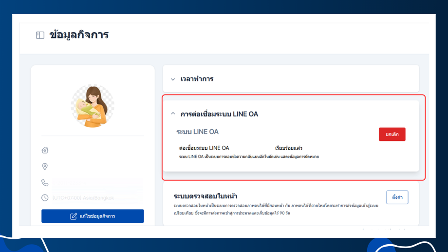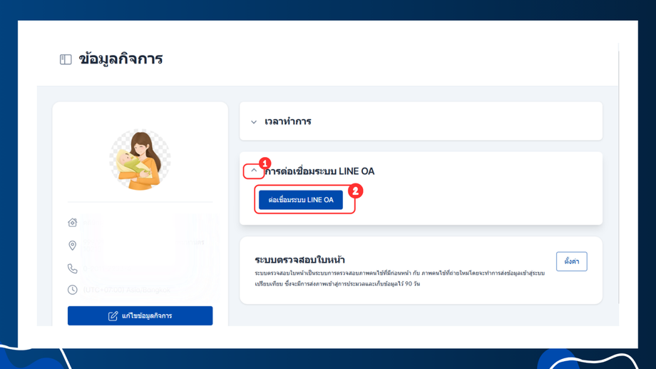 ผู้ใช้งานจะเข้าถึงหน้าข้อมูลกิจการ จากนั้นคลิกที่หัวข้อ การต่อเชื่อมระบบ Line OA ระบบจะแสดงปุ่ม ต่อเชื่อมระบบ LINE OA และ คลิก ต่อเชื่อมระบบ LINE OA