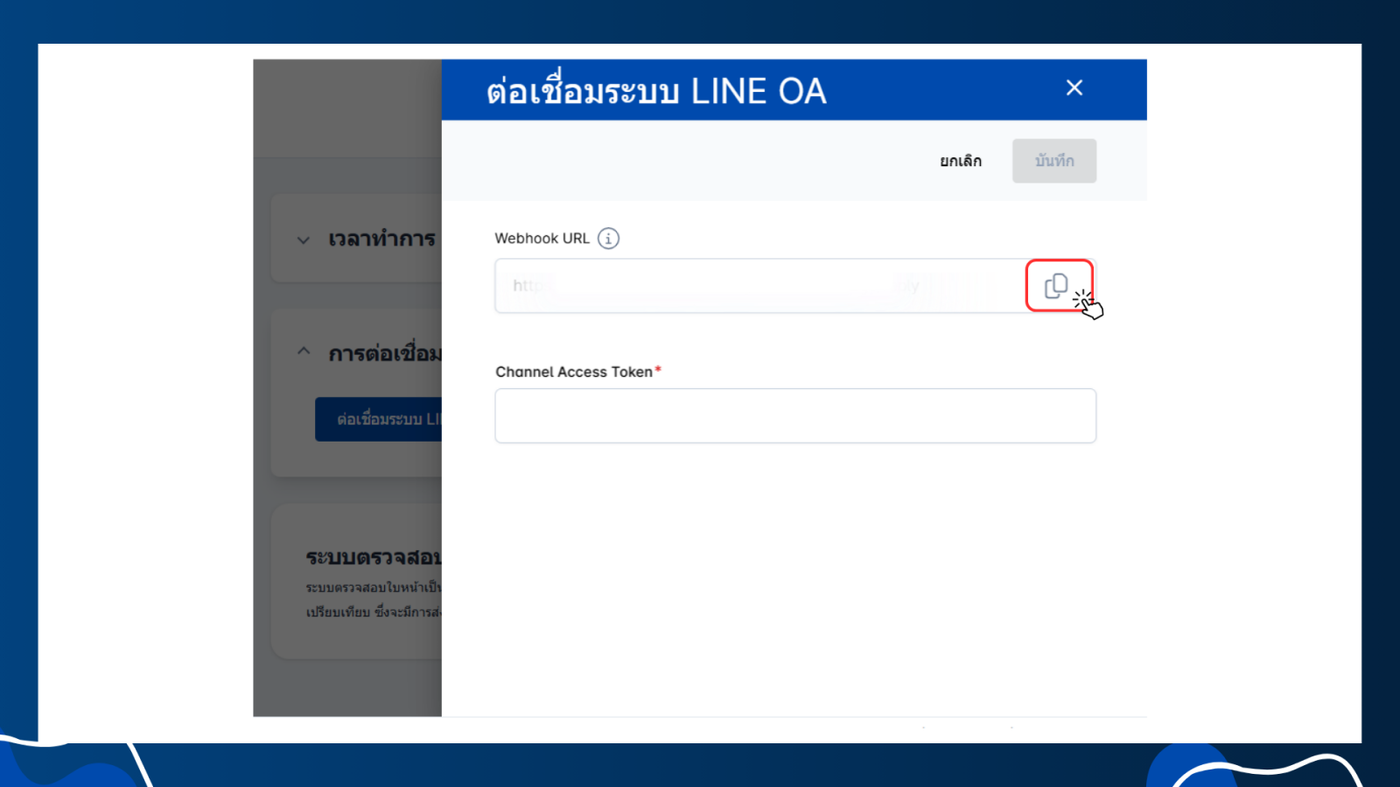 ระบบจะแสดงหน้าต่าง ต่อเชื่อมระบบ LINE OA ประกอบไปด้วย Webhook และ Token ใหทำการกดคลิกที่ปุ่มคัดลอกในช่อง Webhook URL