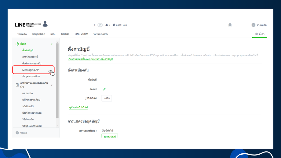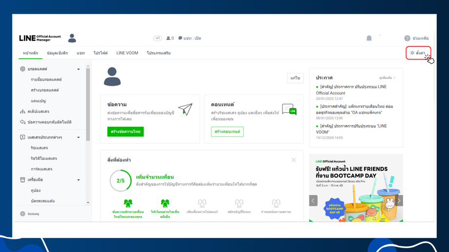เข้าเว็บ Line Official Account Manager และไปที่ ตั้งค่า