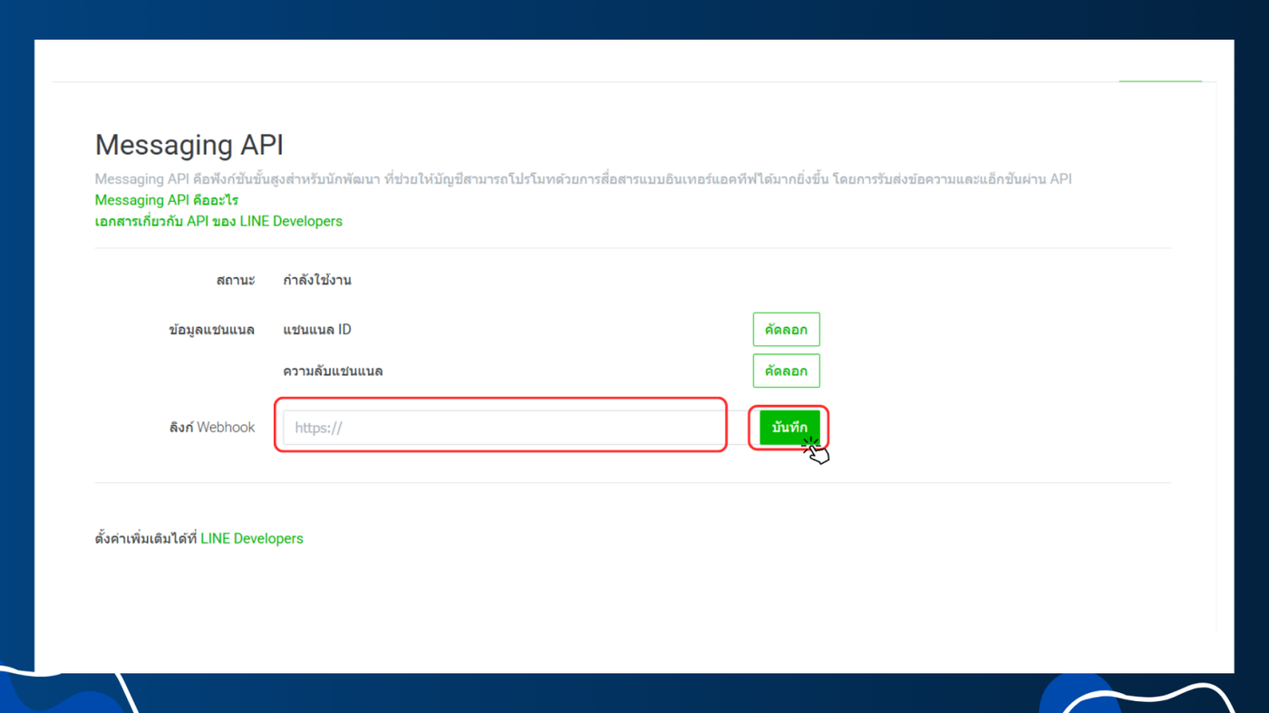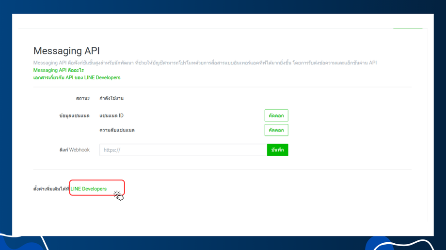 ในขั้นตอนต่อไป จะเป็นการพาผู้ใช้งานนำ Webhook URL ไปใส่ใน Line Official Account Manager