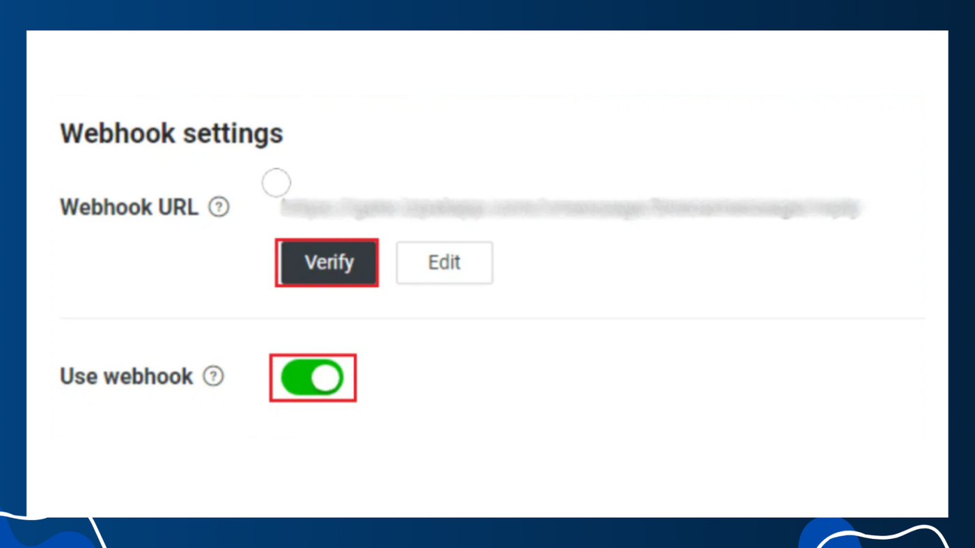 จากนั้นเลื่อนลงหาหัวข้อ Webhook setting ทำการคลิก Verify และ เปิกใช้ Use Webhook