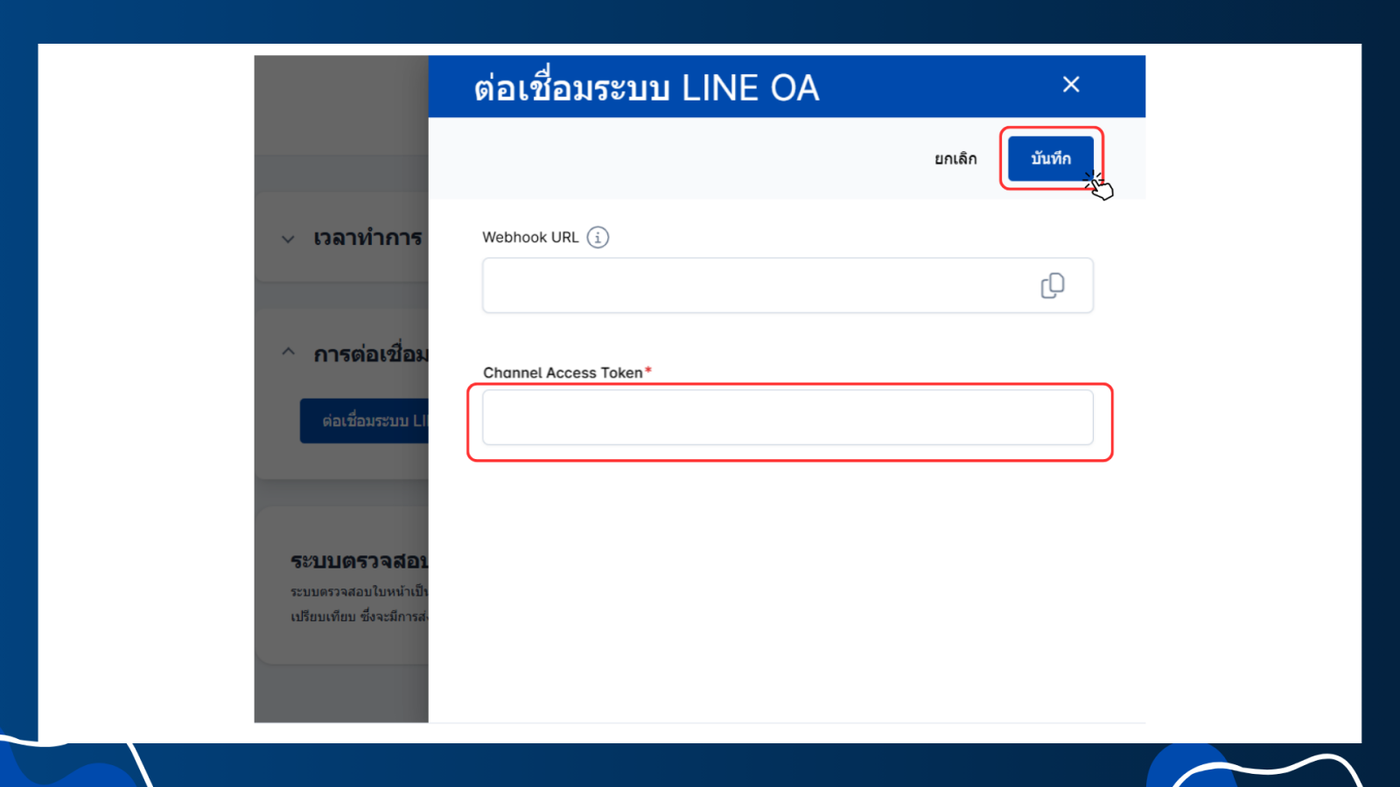 และนำ Token ที่ได้มาใส่ช่อง Channel Access Token ในโปรแกรม Clinic จากนั้นกดบันทึก ระบบจะเชื่อมต่อกับ Line OA