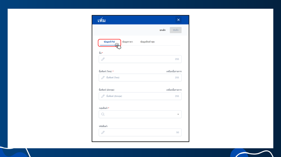 - ข้อมูลทั่วไป: กรอกข้อมูลที่จำเป็น เช่น ชื่อชุด, รหัสชุด, และรายละเอียดอื่นๆ