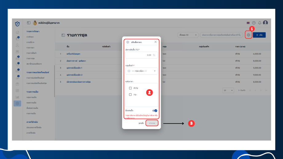 สามารถแก้ไขราคารายการชุดได้ทุกรายการได้โดยคิดเพิ่มเป็นอัตราปรับขึ้นเป็น %