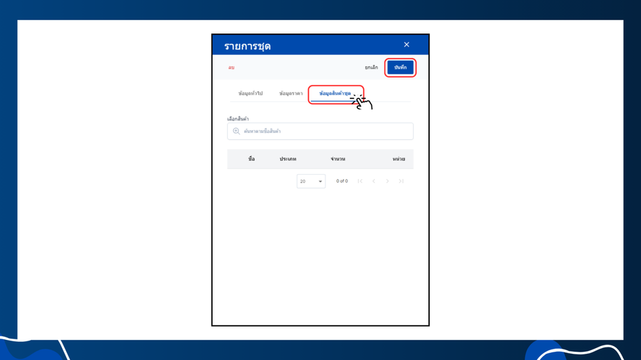 - ข้อมูลสินค้าชุด: เลือกสินค้าหรือยา ที่ต้องการรวมเป็นชุดเดียว