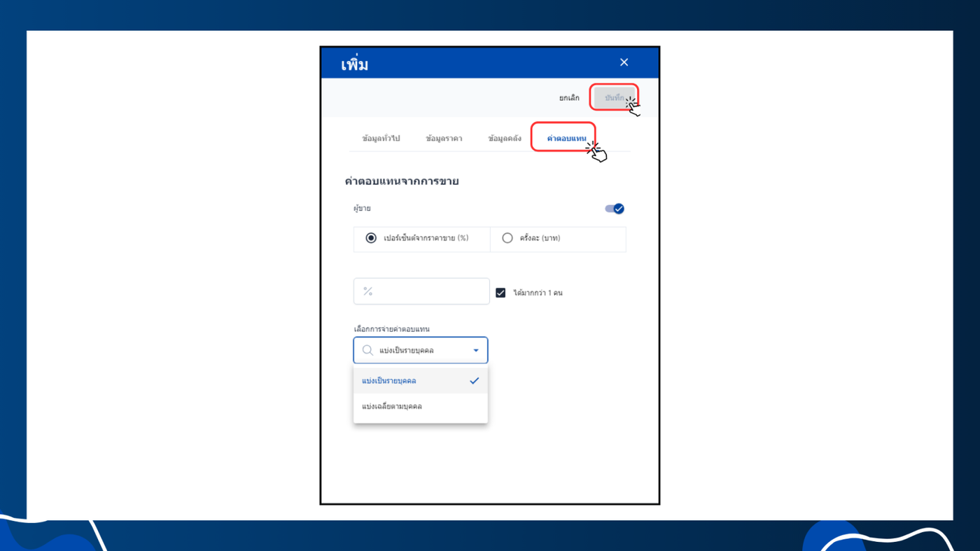 - เลือกการให้ค่าตอบแทนเป็นเปอร์เซ็นต์ หรือเป็นจำนวนเงิน