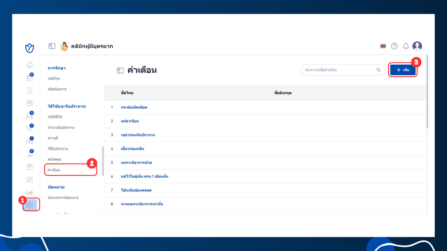การตั้งค่าคำเตือน คือระบุคำเตือนในการใช้ยา จะเป็นการบันทึกข้อมูลเพื่อไปเรียกใช้ในส่วน คำเตือนเพื่อไปผูกกับรายการยา และ แสดงผลการพิมพ์ฉลากยา