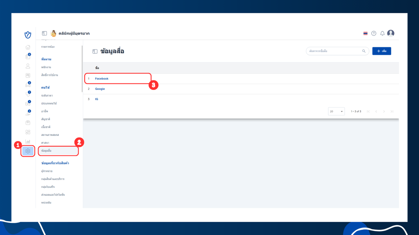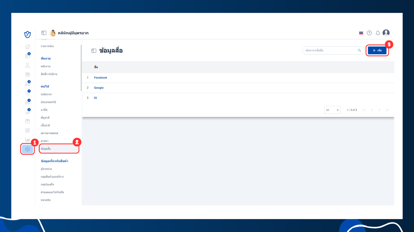 ข้อมูลสื่อคือแหล่งที่มาของลูกค้าหรือคนไข้ที่ใช้บริการของเรา ซึ่งจะช่วยให้ทราบว่าลูกค้าได้รู้จักบริการของเราจากช่องทางไหน