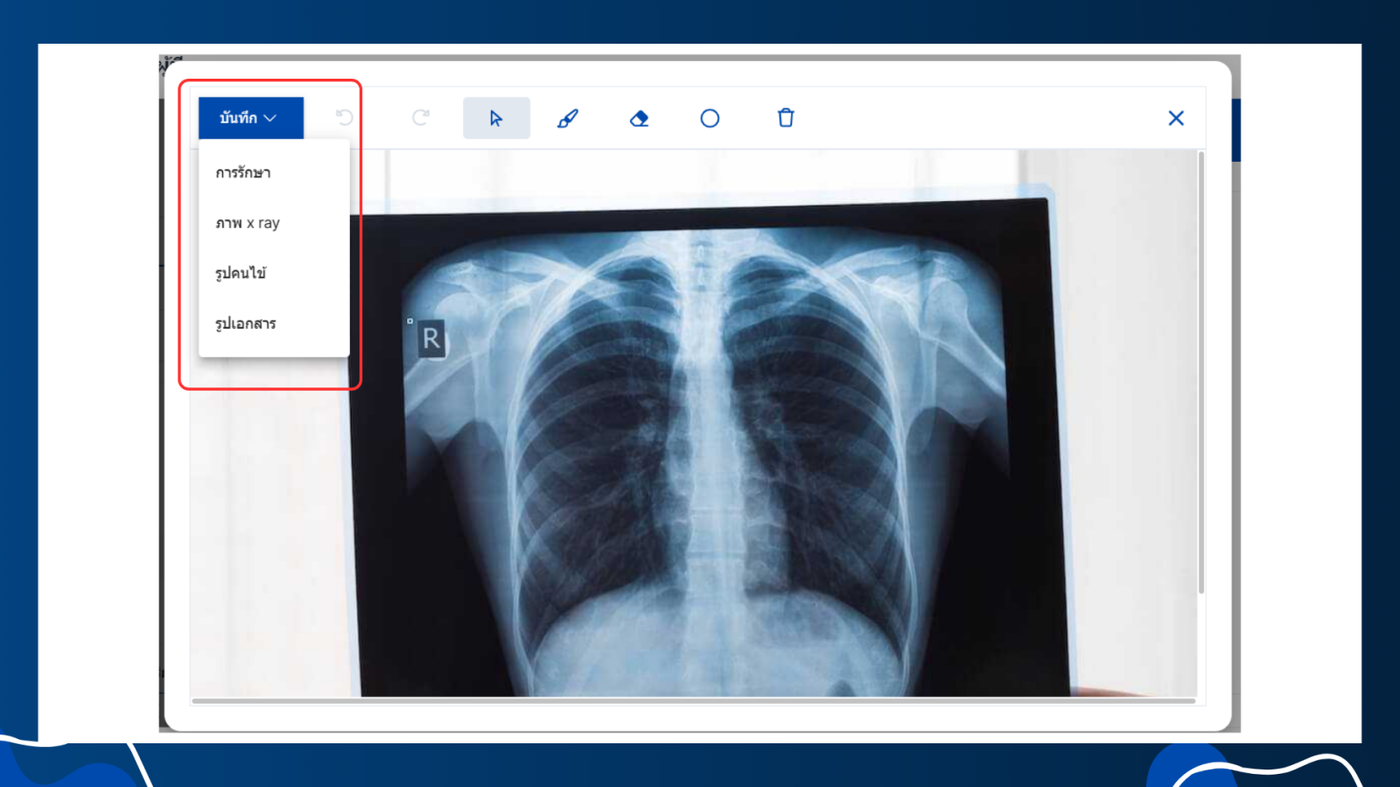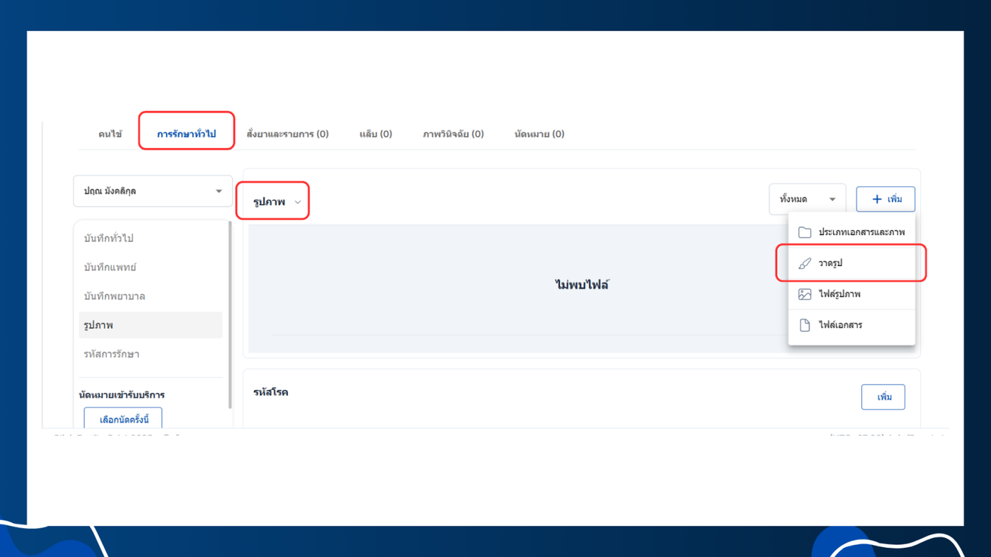 จะอยู่ในห้องตรวจรักษา คลิกไปที่การรักษาทั่วไป เลื่อนลงไปที่หัวข้อรูปภาพ เลือกหัวข้อวาดรูป