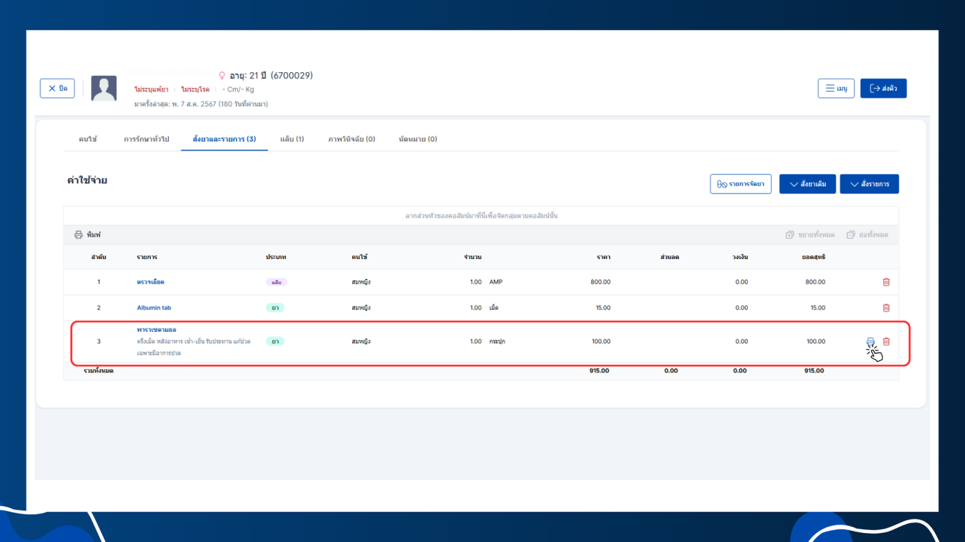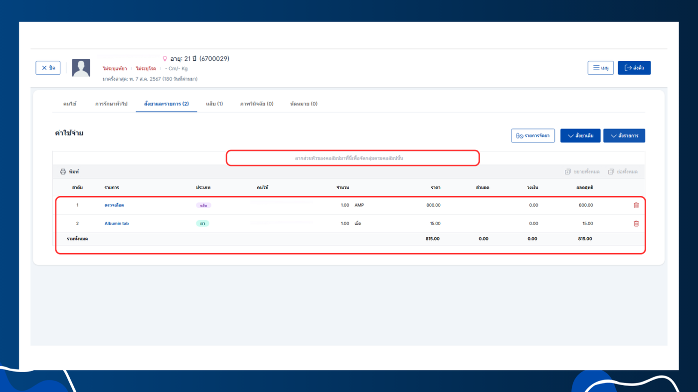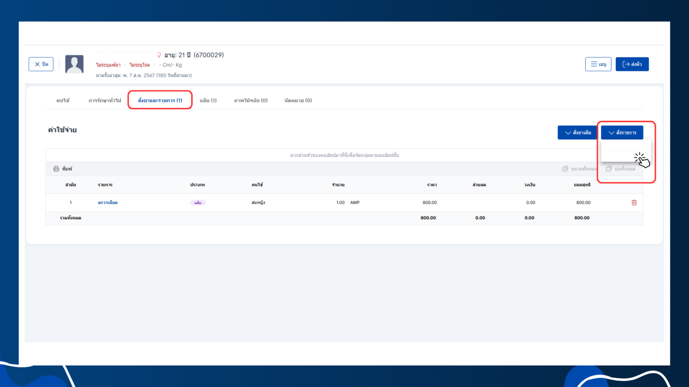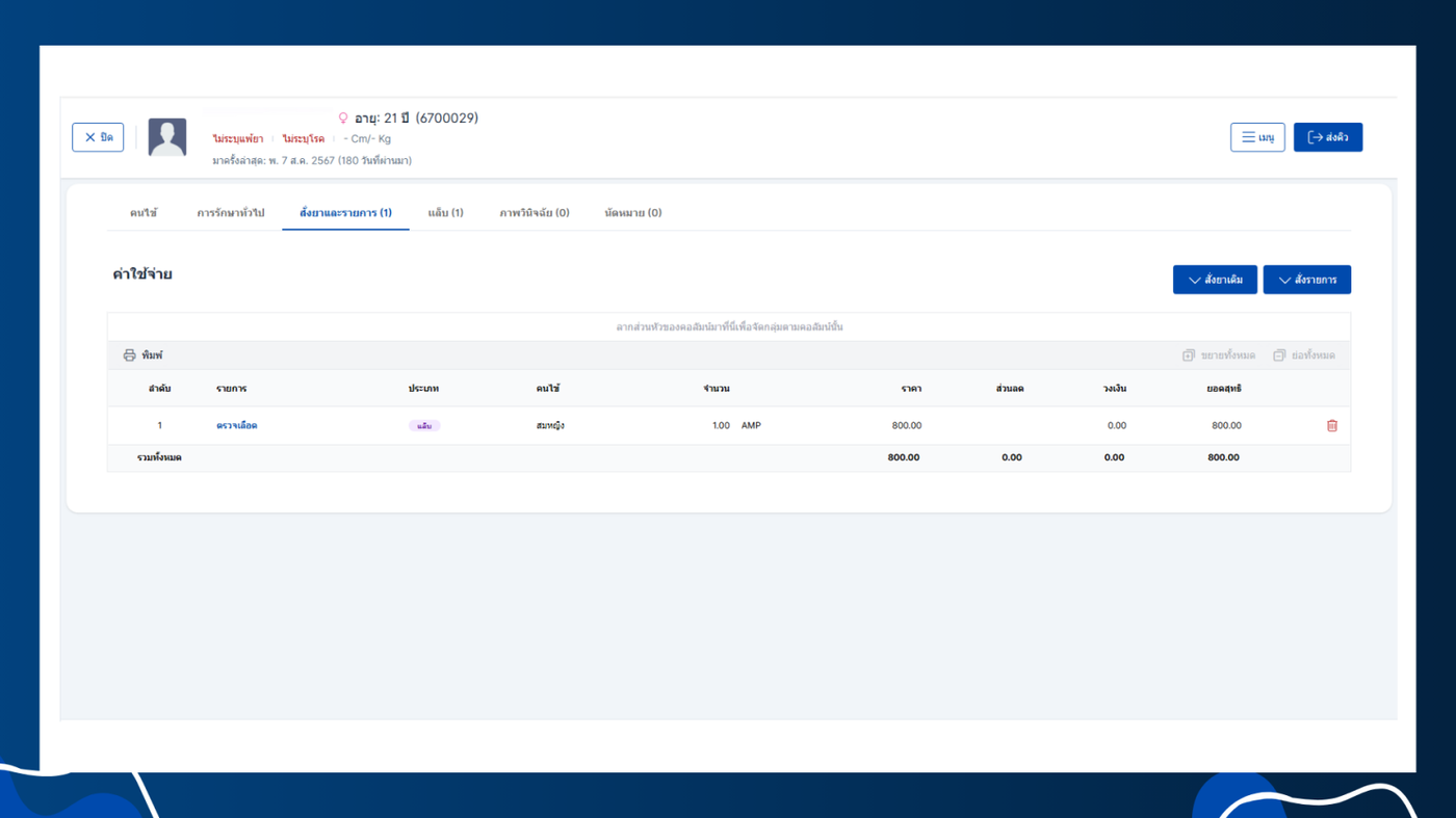 - ในช่องค่าใช้จ่ายสามารถทำรายการสั่งยา แล็บ เอ็กซเรย์ และอื่นๆได้