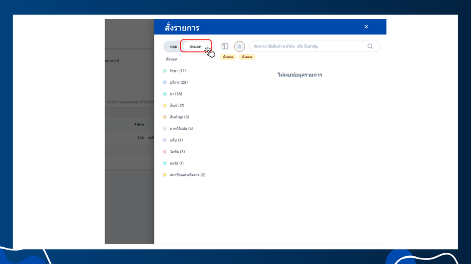 - คลิกที่สั่งรายการ เลือกหัวข้อประเภทจะสามารถสั่งรายการ รักษา บริการ ยา สินค้า สินค้าชุด ภาพวินิจฉัย เเล็บ วัคซีน คอร์ส และอื่นๆได้