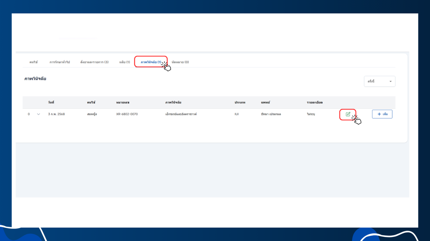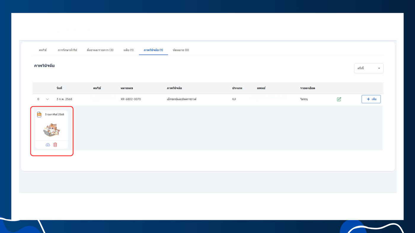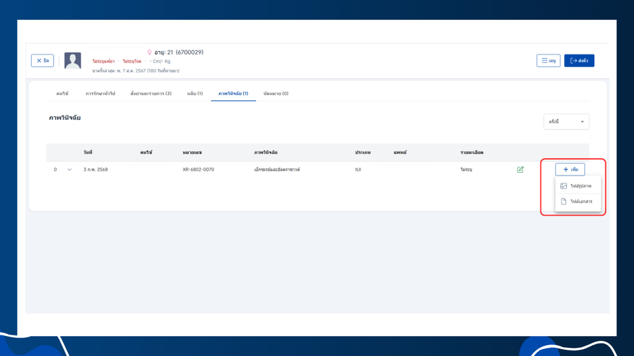 - การเพิ่มเพิ่มไฟล์เอกสารหรือรูปภาพให้ผู้ใช้งานเข้าสู่หัวข้อ เอ็กซเรย์ จากนั้นคลิกเพิ่มเลือกรูปแบบไฟล์ที่ผู้ใช้งานต้องการเพิ่ม